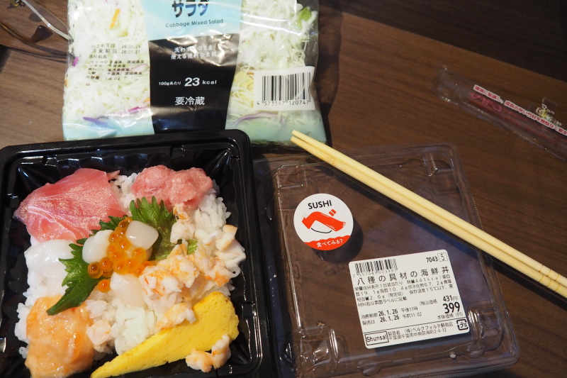 | 晩ご飯にスーパーで買った海鮮丼。 | ||