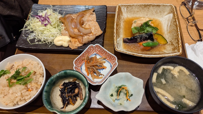 | 鳴子温泉駅の待合室。 | お昼に食べた定食。 | |