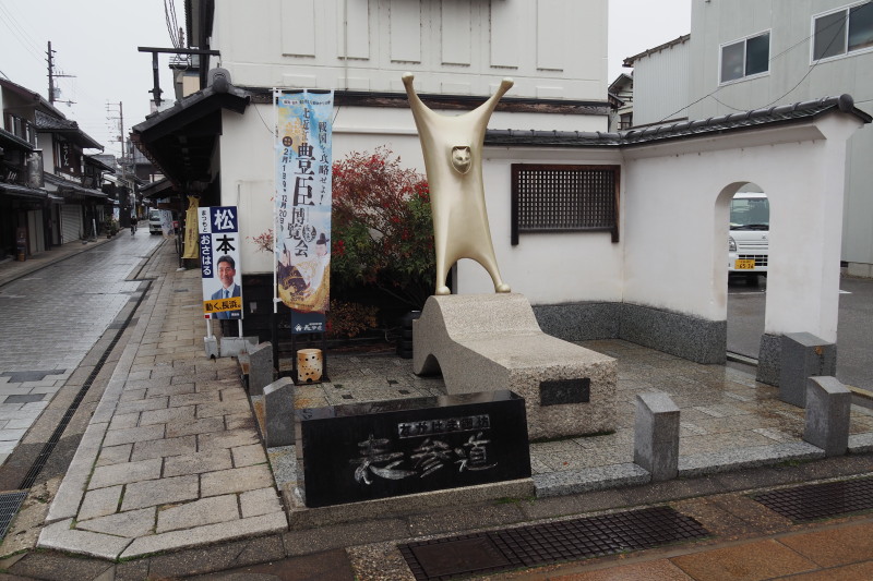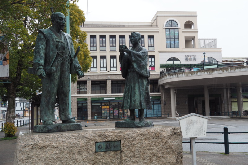 | 長浜駅前の秀吉と石田三成像。光成が秀吉にお茶を献じているところ。 | ||
