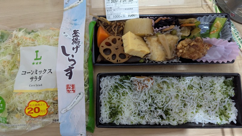 | 清洲駅。 | 名古屋駅の高島屋地下で購入した釜揚げしらす弁当(晩ご飯)。 | |