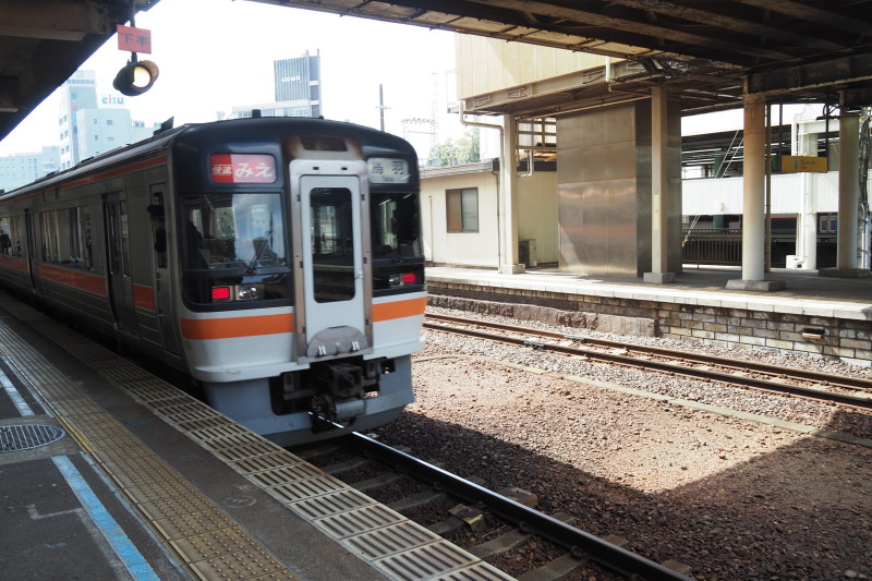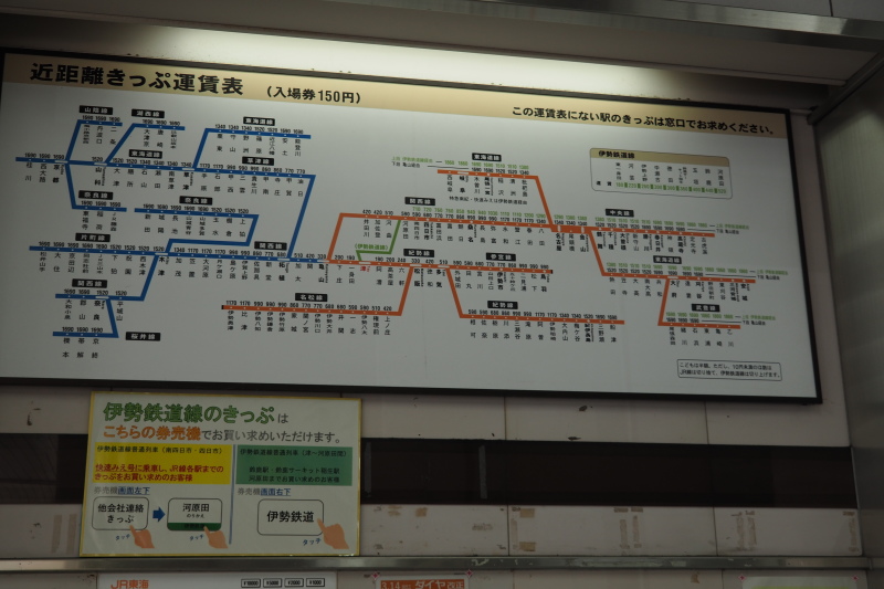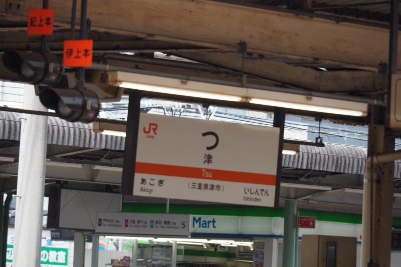| 名古屋駅から津駅までは、JR快速「みえ」で。駅名表示では、ひらがなの「つ」の下に漢字の「津」があると「?」のように見えてしまう。 | |