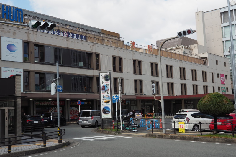 | 津駅のJRの料金表JRは、切符を買って乗車。 | 津駅前。右側に宿泊したドーミーイン津。 |