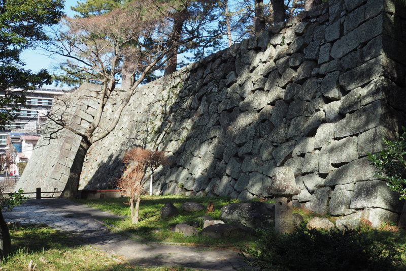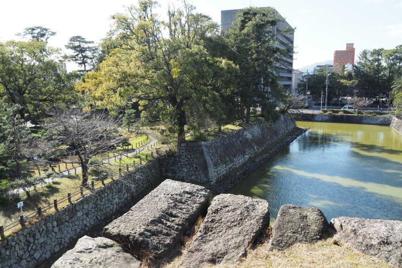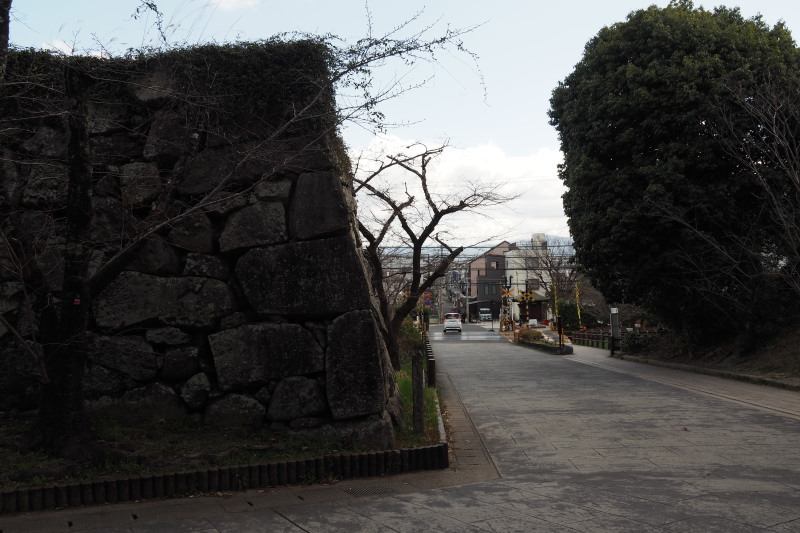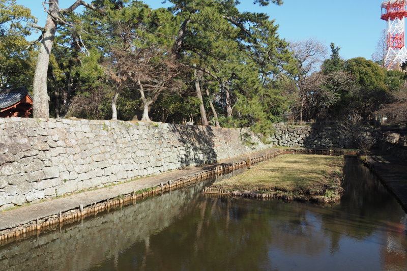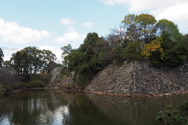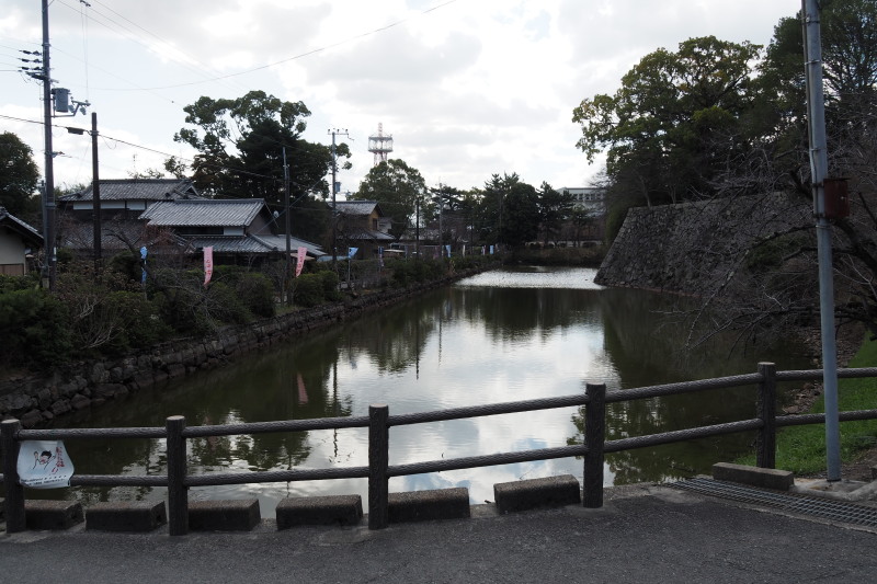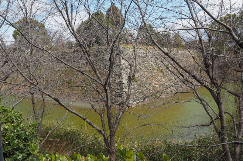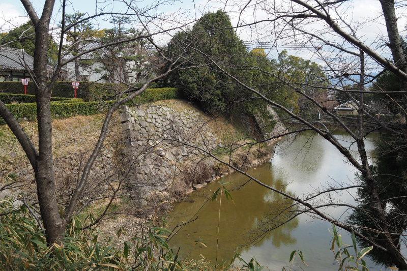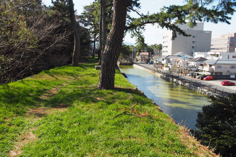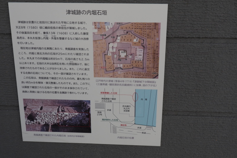 | 商店街にあった藤堂高虎像。 | 津城跡の内堀の石垣。 |
