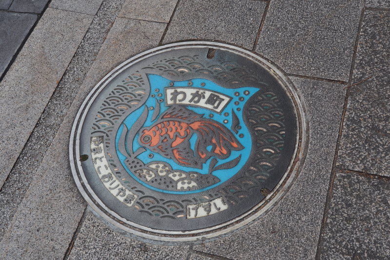| 近鉄と大和郡山城。 | 大和郡山のマンホール。金魚がデザインされている。 |