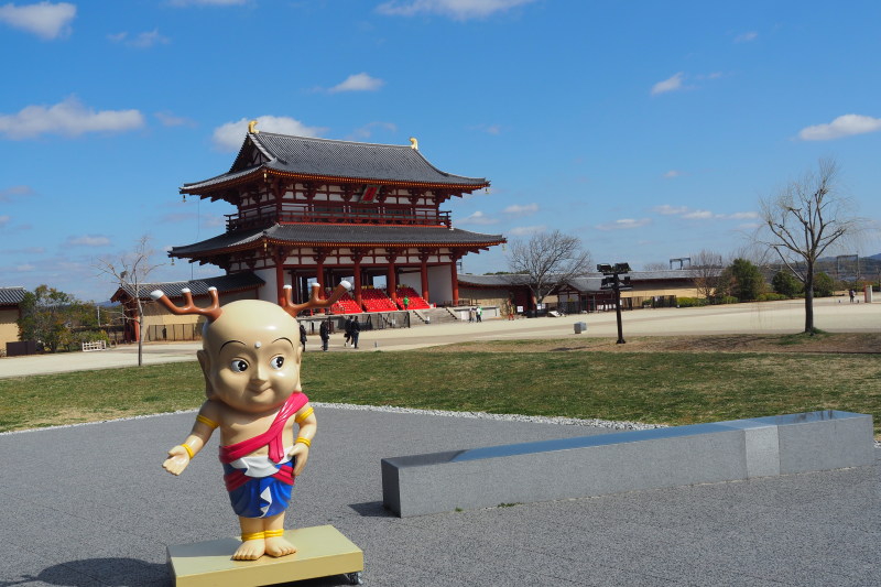 | JR奈良駅の観光案内所にあった「しかまろくん」。 | 平城京跡にあった遣唐使船。 |