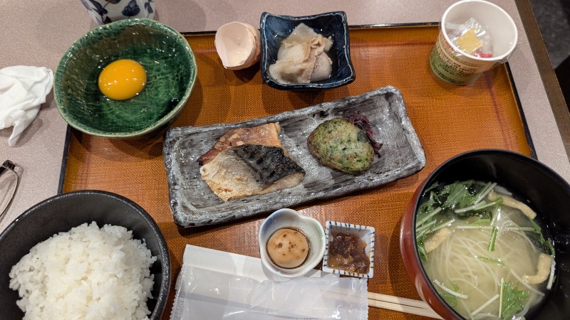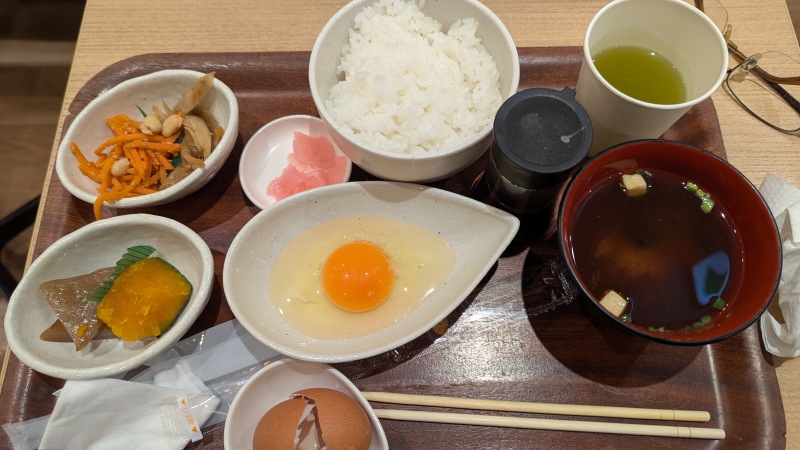 | 津駅前。JRと近鉄が乗り入れている。JRは切符のみ。近鉄は、Suicaで乗車できる。 | 津駅の食堂にあった「卵かけご飯定食」。 |
