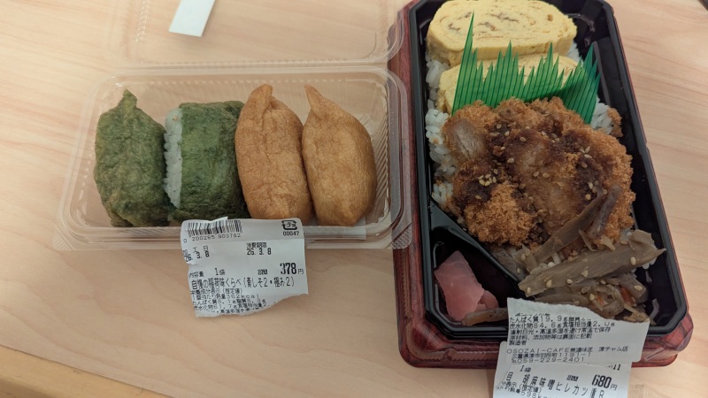 ←津駅の食堂で買った晩ご飯。緑色に色づけした油揚げで作ったいなり寿司。 |