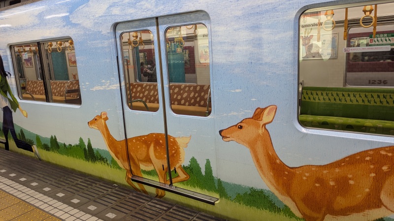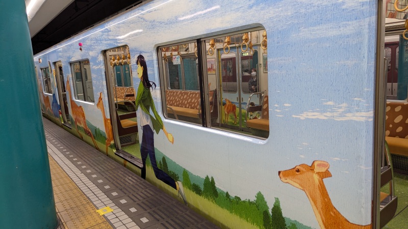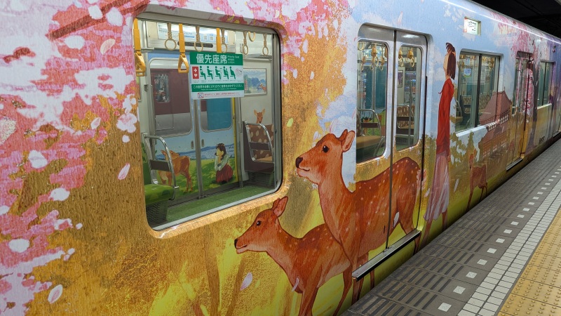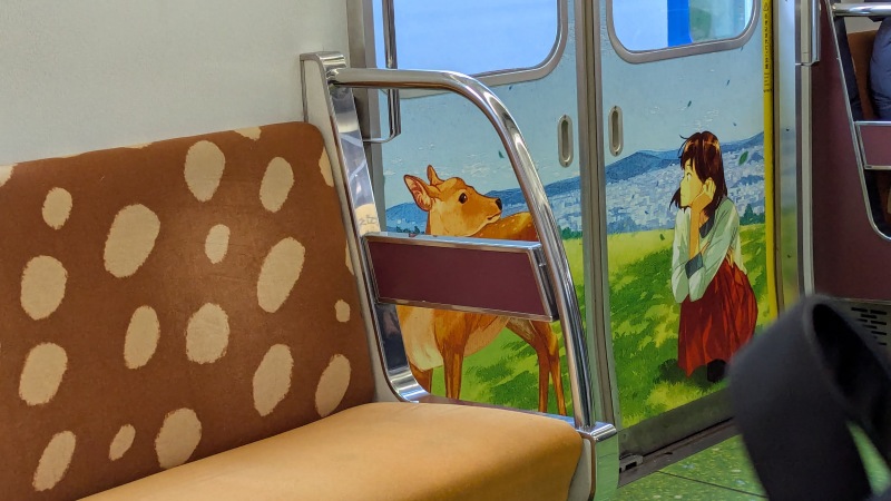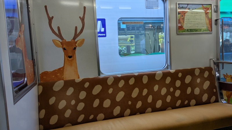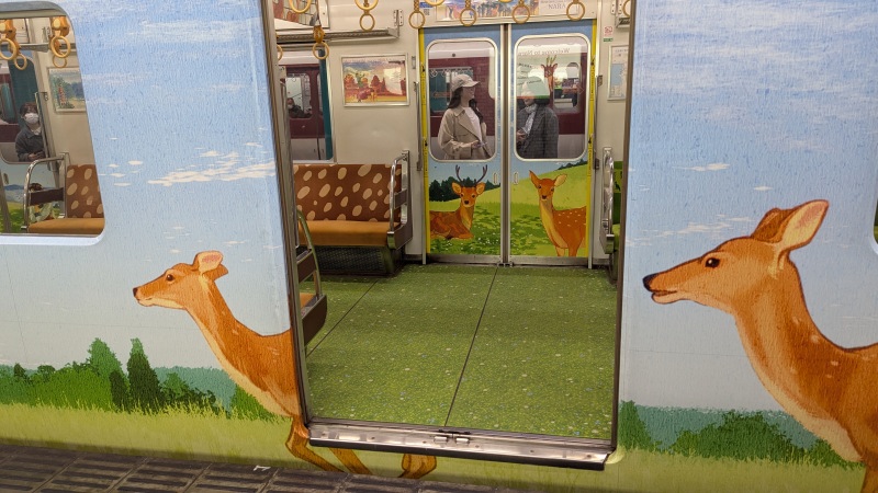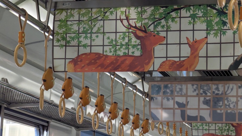 | ひのとりのマーク。鶴橋駅で降りて、近鉄で近鉄奈良駅へ。 | 近鉄の車内の鹿の飾り。 |